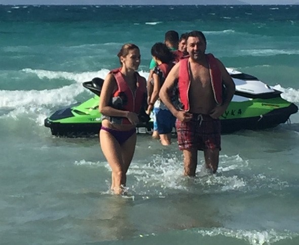 Teknede Eser Yenenler de vardı. Ekip daha sonra zodyakla Zio Beach'e geçti. Boz, hızlı giden bottan düşmesin diye sevgilisine sıkı sıkı sarıldı.